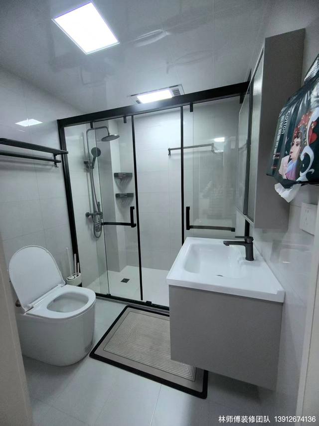 卫生间面积虽小,但做到了干湿分离—— 用玻璃淋浴房划分淋浴区,避免洗澡后地面积水。马桶、花洒选择了简约款,质量可靠且易清洁;吊顶采用防水铝扣板,搭配嵌入式浴霸,冬季洗澡也能保持温暖。值得一提的是,这些也都包含在6.8 万预算内,没有额外增项,性价比拉满。