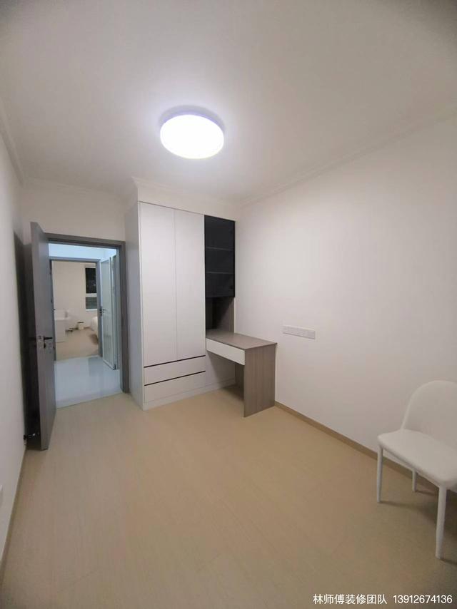 次卧则兼顾了 “睡眠” 与 “学习” 功能,除了定制通顶衣柜外,还延伸出了一个小书桌,平时孩子在这里写作业、看书,非常方便,让小次卧实现 “一房两用”。