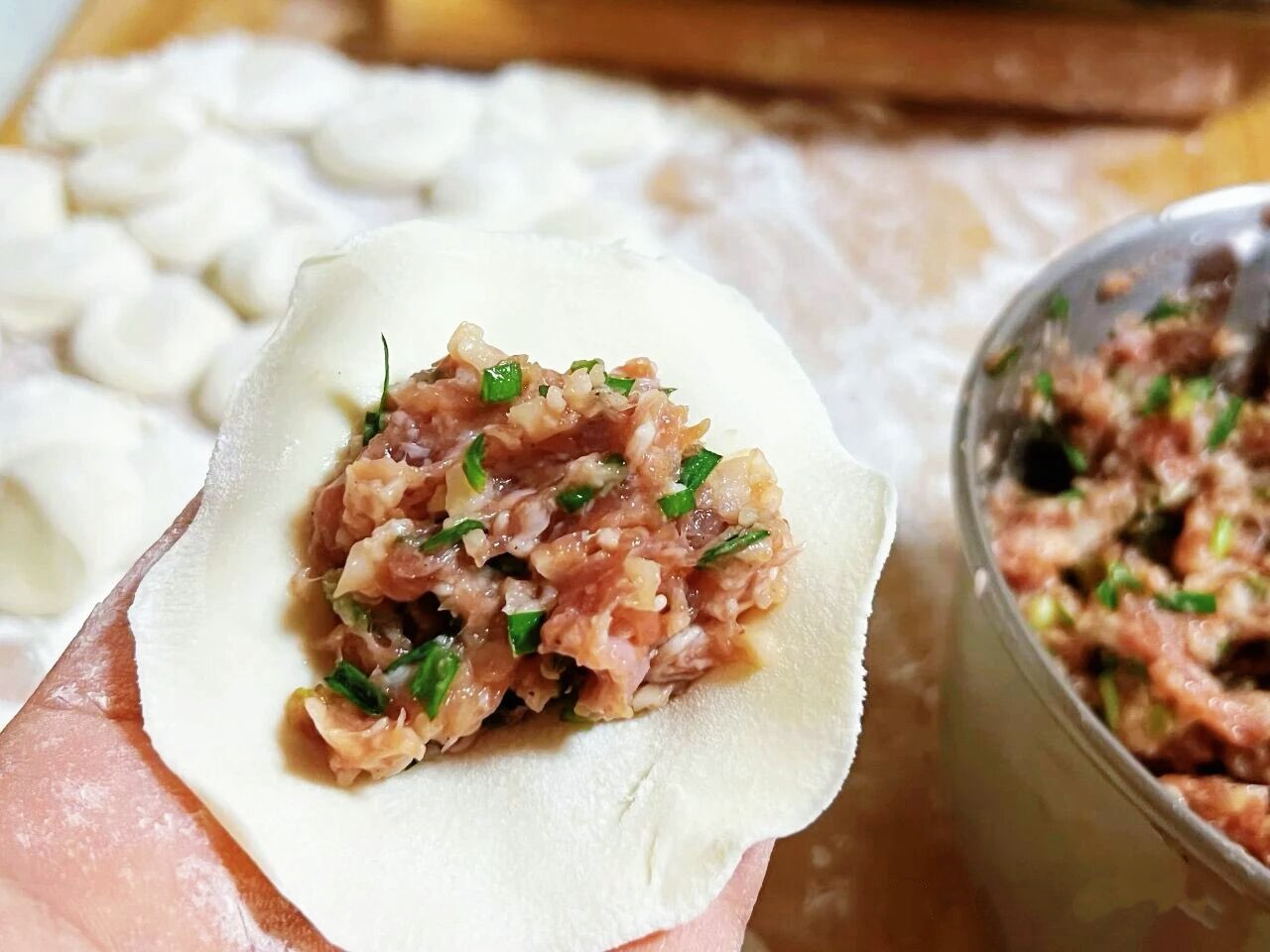 休息天没事做,睡到自然醒。胖子说他今天给我解锁一个饺子的新吃法,自己和面包饺子,我说去超市买点饺子皮不是更方便吗,他说要的就是动手的乐趣。好吧,一起动手丰衣足食。我会揉面胖子会擀皮,瞎弄弄吧,笨人笨活,我用瓶盖在面皮上盖个圈,圆圆的凑合着,感觉也挺好用的,果真男女搭档干活不累,嘻嘻哈哈的,一会儿饺子就包好了。胖子喜欢吃肉,我怕肉不熟,先把包好的饺子放进锅中蒸熟,乘这时间段拿四个鸡蛋敲碎去除蛋壳放入碗中蛋液搅拌均匀备用,锅里刷油放入饺子四周淋上鸡蛋液,小火煮一下即可,出锅前撒几粒芝麻和小香葱。装盘,瞧瞧好不好看,闻闻香不香,想不想吃,想吃的来我家,请你吃到撑。