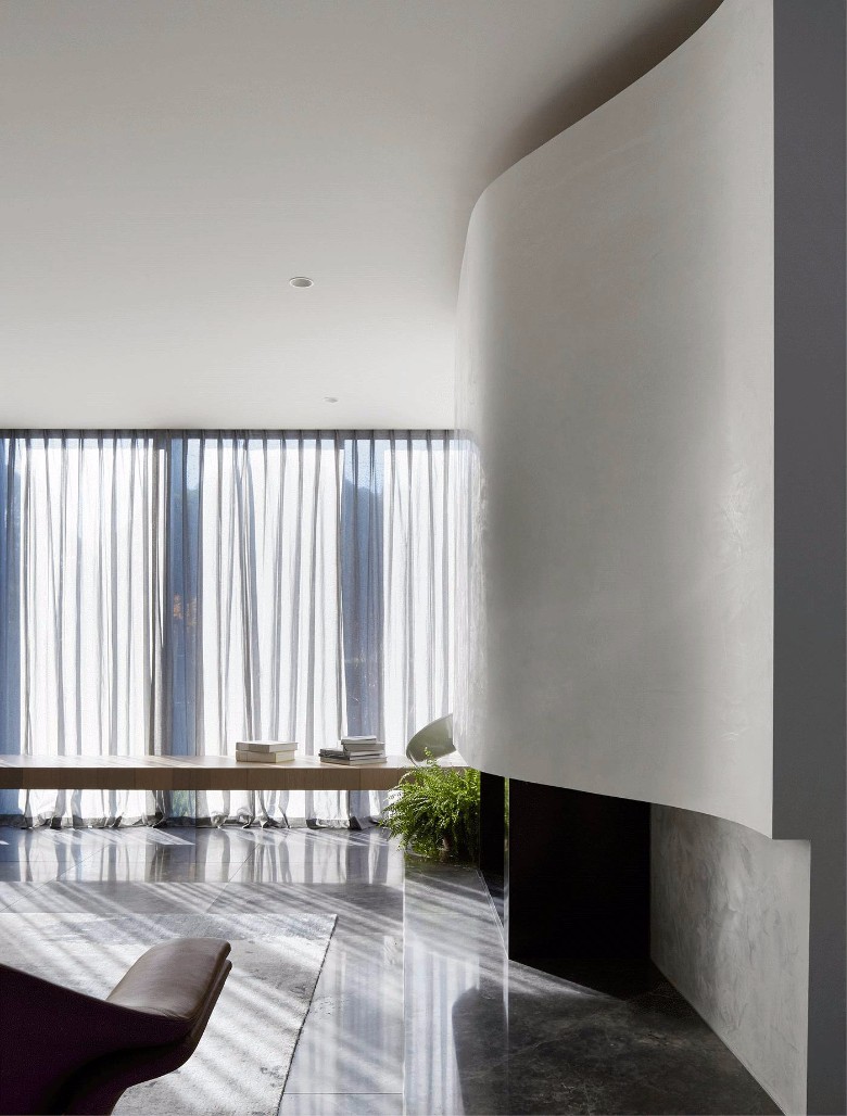 从前门进入,带着优雅弯曲的壁炉通往休息室,空间感觉柔软而温暖。