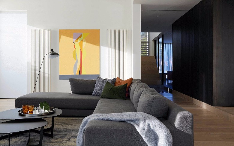 光线透过窗户,自然的元素如烟熏橡木地板,优雅的灰色大理石和黑色的染色木材,营造出一种柔和的奢华感。