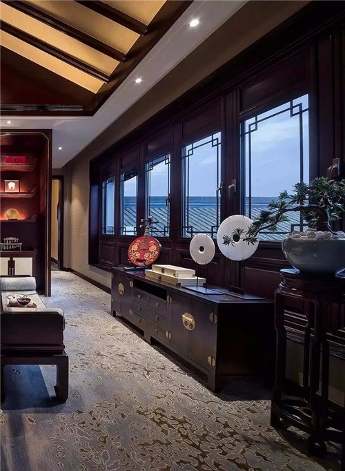 设计师攫取了深根于东方哲学的传统中式住宅设计思想,在室内布置、线形、色调以及家具、陈设的造型等方面,充分汲取传统元素的“形”与“神”,以“花中之王”—牡丹为主题线索。
