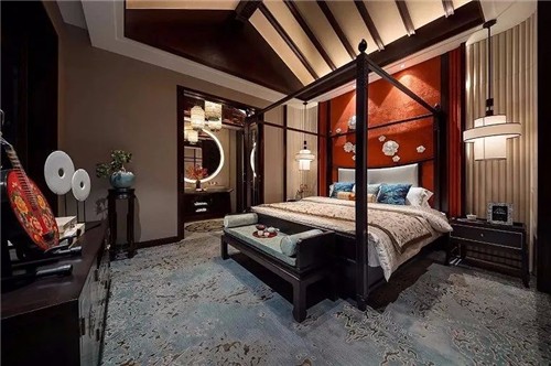 以不同灰度相融调节视觉调性,强调舒适感,床头的手绘墙纸再次唱响“牡丹”主题,在中式吊灯的映衬下,盛开得格外艳丽。