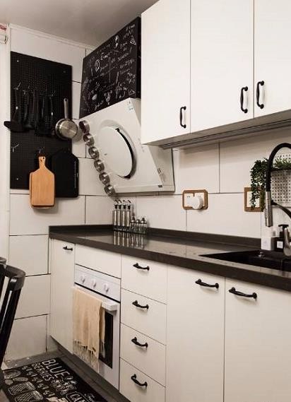 首先是吊柜的高度以及吊架的挂设高度,甚至厨房中悬挂物的尺寸都要好好计算一下,根据家人的身高来设计,避免个子高大的一不小心撞上头,同时吊柜的宽度应设计得比工作台窄。抽油烟机的高度也不能忽略,一定要以使用者身高为基准,最好比头部略高一点,否则“头破血流”不可避免,一般来说抽油烟机与 灶台的距离不宜超过60厘米。