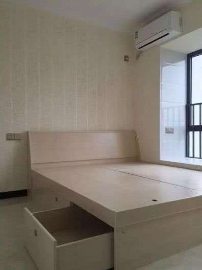 主卧里的床下面也是一个很大的收纳空间,省去了不少的位置。卧室里是米色的壁纸,看起来非常温馨,很符合卧室里的舒适的氛围。