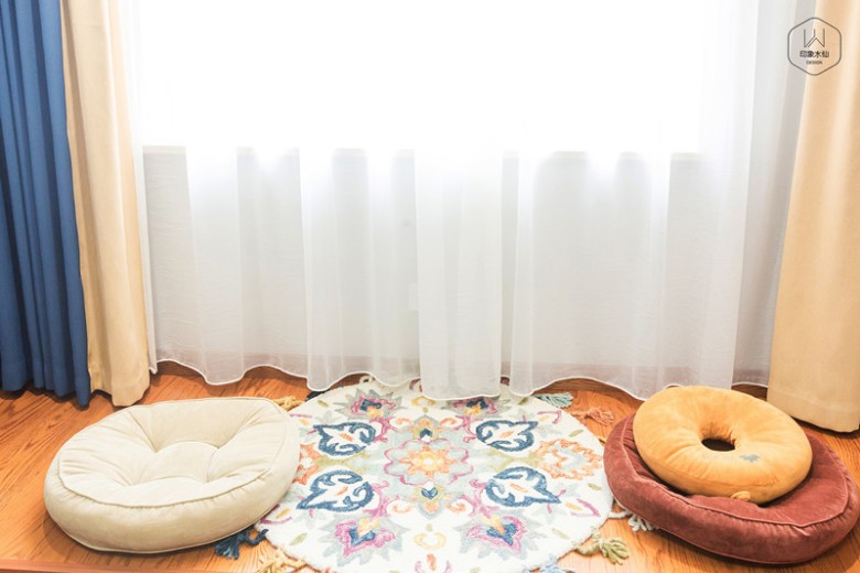 浅蓝色背景墙搭配拼色窗帘,阳光透过白纱,清新质朴,深色大床与床头柜让整个空间更为雅致,地台上的复古坐垫让卧室披上浪漫情调,整体色调和谐优雅。