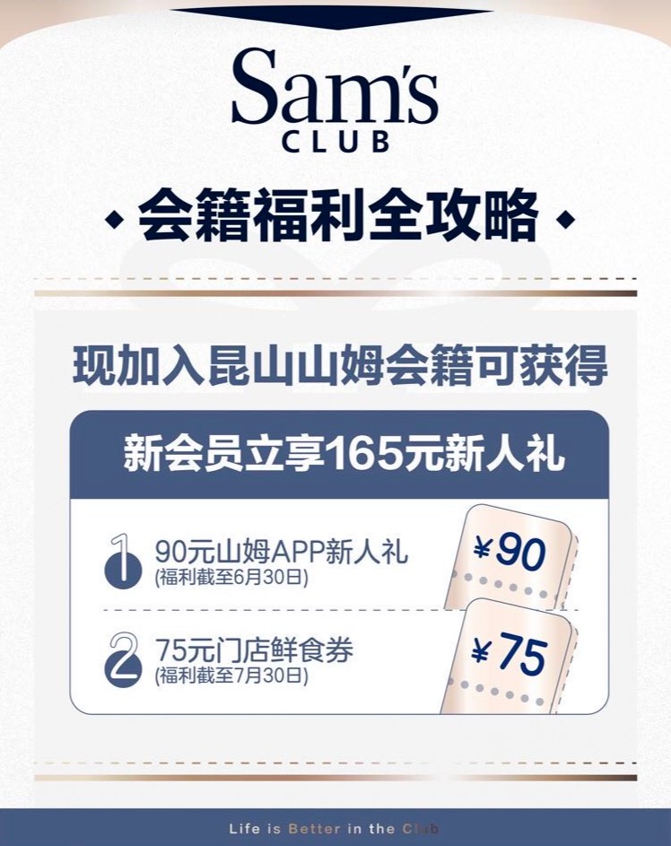 新会员福利多多!现在成为昆山山姆会员,你即将拥有165元新人券。90元山姆app新人礼+75元门店鲜食券,满满都是诚意!