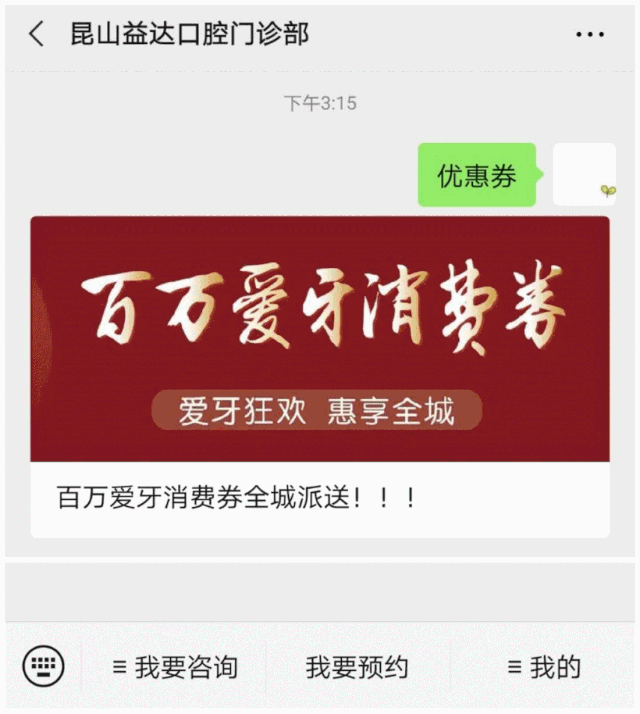 2、对话框回复“优惠券 ”,即可领取4500元爱牙消费券