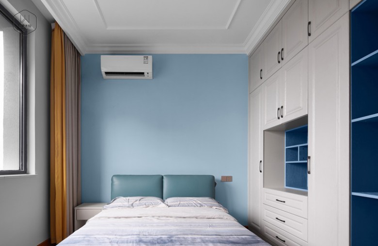 男孩房选择蓝黄对比色,更显活泼灵动,一整排白色定制衣柜搭配局部深蓝色柜体,将一年四季的衣物合理收纳,井然有序的生活,更加轻松舒适。 Parents Room