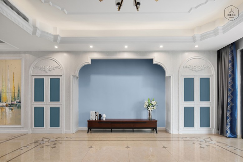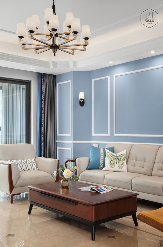 揽景入室,客厅的设计看似低调,却无处不透露着细节与巧思;沙发背景选择清新的蓝色,与白色石膏板结合,干净利落,增加了空间层次与立体感;美式壁灯如点睛之笔,电视背景做了对称的艺术造型,赋予整个空间优雅温馨的气质。