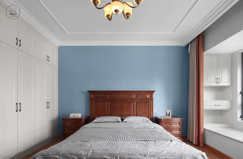 主卧床头背景选择蓝色乳胶漆,简单却不失温柔,棕红色的实木家具,结合拼色暖色系窗帘,触摸舒适的床品,岁月的温柔一如既往。精致复古的吊灯,似乎也在娓娓诉说关于爱的故事。 Kids Room 1