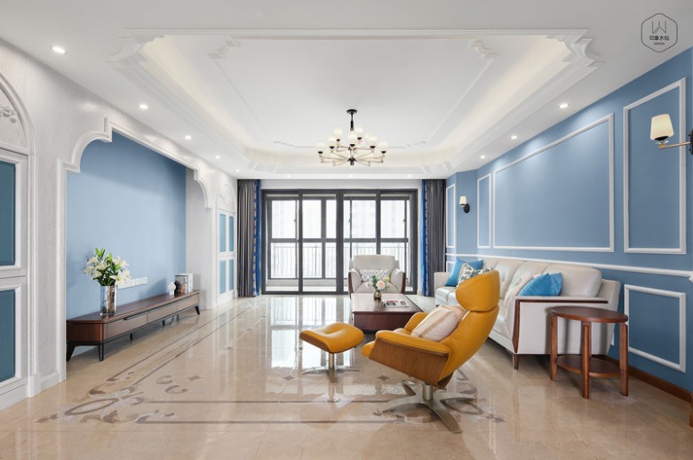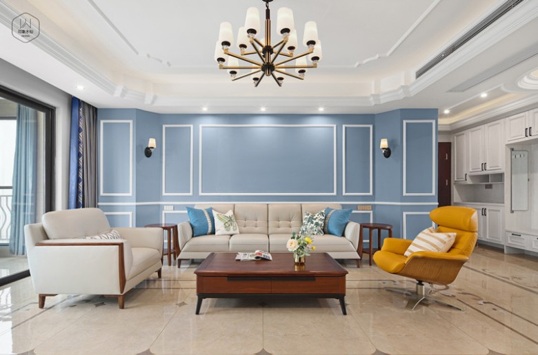 米白色的皮质沙发,精致的美式吊灯,结合实木茶几,散发唯美的端庄感,黄色单人椅更是让空间多了一份活力与俏皮。