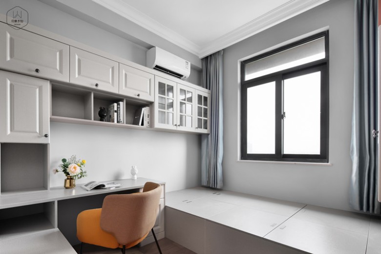 老人房,墙面选择低调的浅灰色,温柔的拼色窗帘,结合实木家具和温馨的床品,每一处都在细说着生活的美好。夜半,渲染上一层朦胧,让每一场美梦都变的柔软甜蜜。 Study