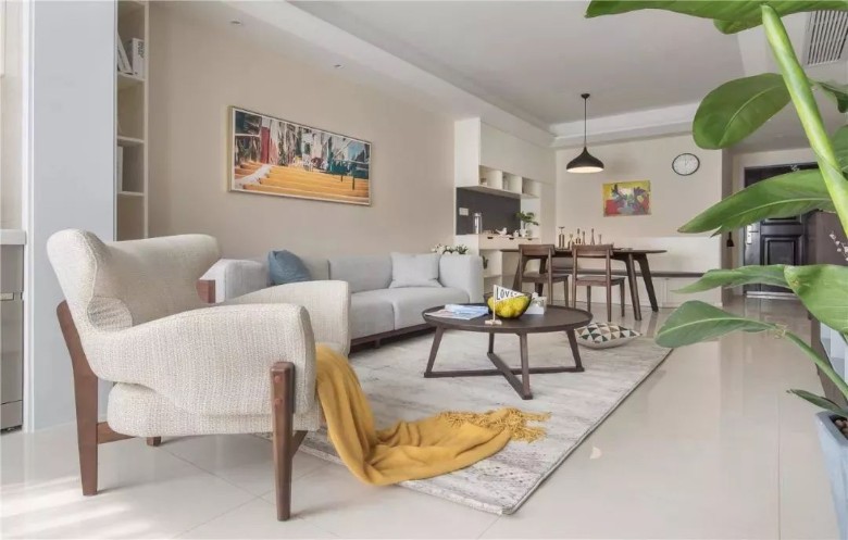 无隔断开放式格局,客厅与餐厅相通,仅通过中间过道将会客区和用餐区自然分开,整体空间看起来更加明亮开阔。