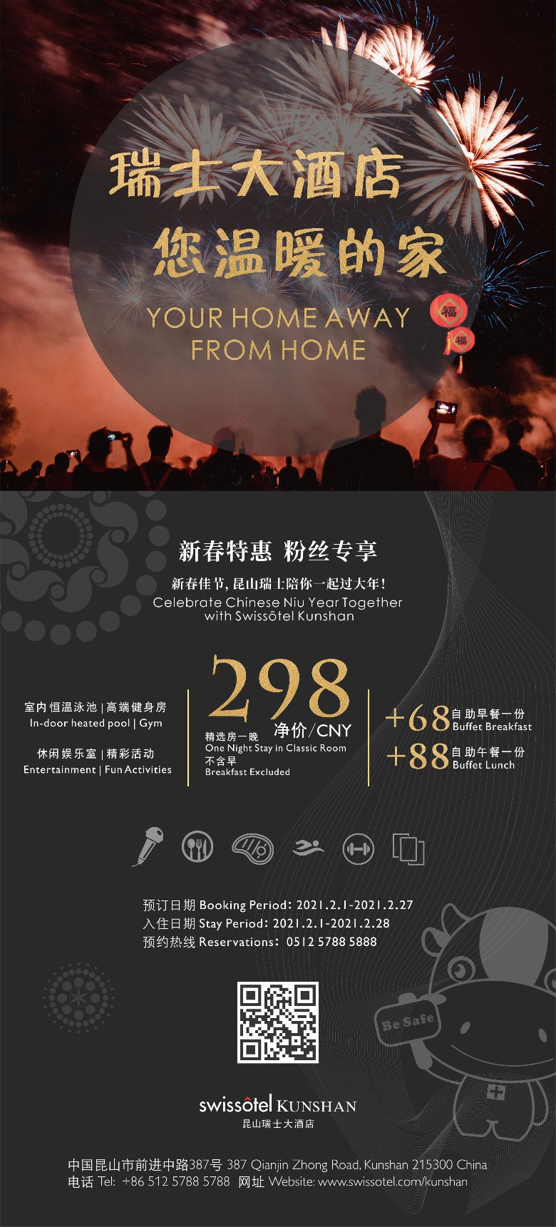 在这个欢乐的中国年,疫情分隔不开我们与家人浓浓的情感,疫情使我们更加团结,也更加珍惜当下。即便回不去家乡留在昆山,昆山瑞士大酒店也是您温暖的港湾。