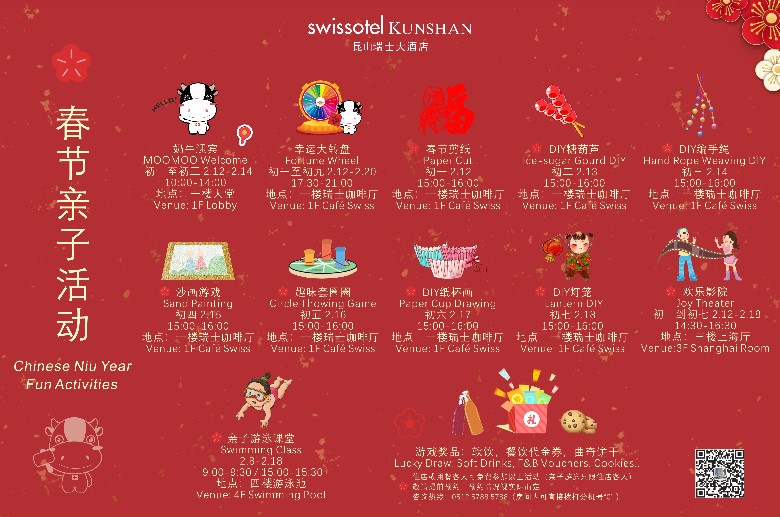 平时工作繁忙,若您想趁过年多陪陪小朋友,昆山瑞士大酒店还为您精心准备了丰富多彩的亲子活动,吉祥物MOOMOO迎宾,新春剪纸,各色DYI活动,亲子游泳、欢乐影院等等,一定能让您和小朋友享受欢乐的新春亲子好时光。