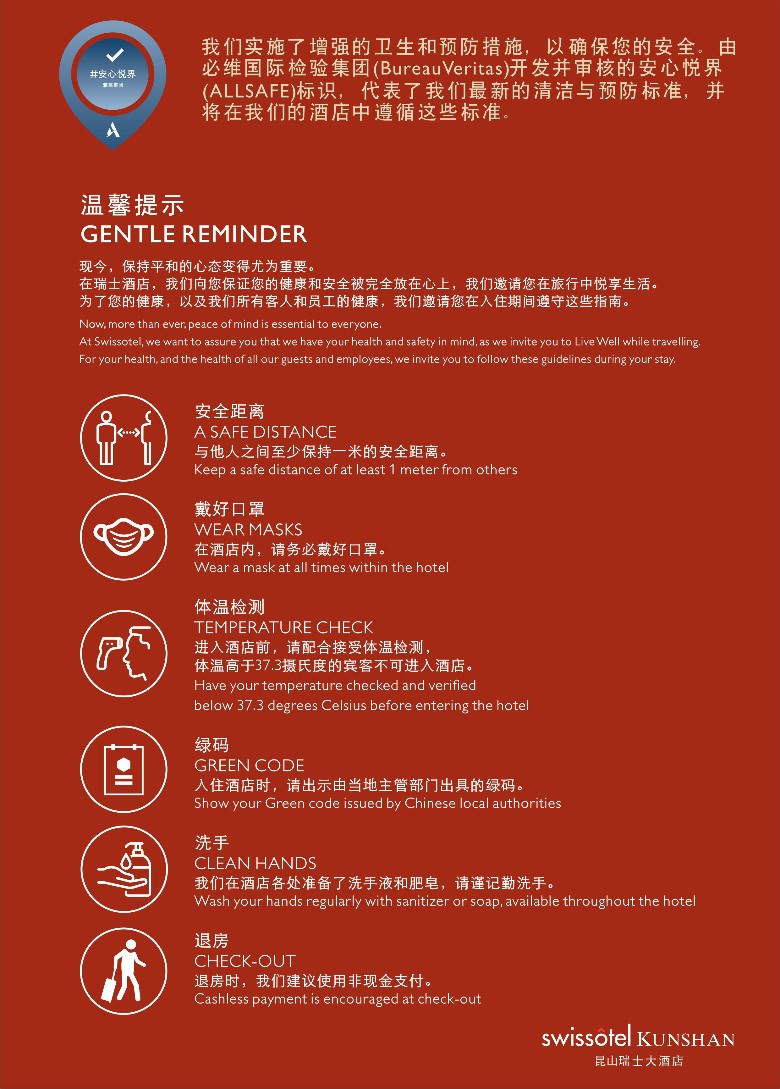 昆山瑞士大酒店为雅高集团ALLSAFE安心悦界认证酒店,ALLSAFE计划将确保酒店的各项服务让宾客放心入住,安全享受用餐,娱乐以及会议的乐趣。
