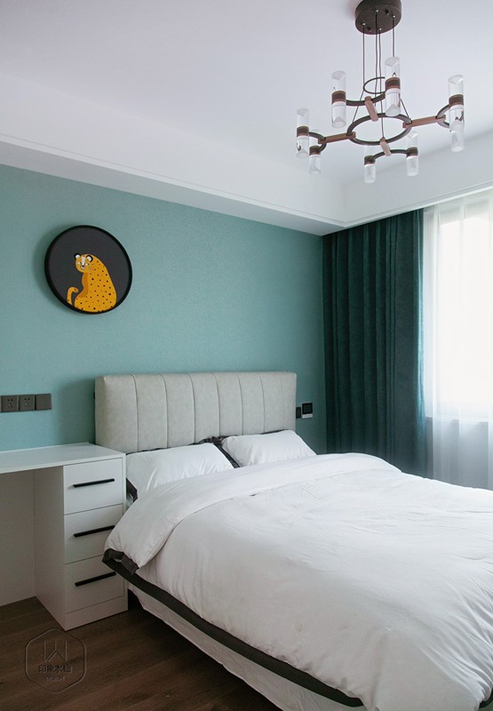 硬装选择鲜活的淡绿色,家具一律选择浅色系,让空间看起来更加舒适,圆形卡通壁画的选择让空间更加活力。