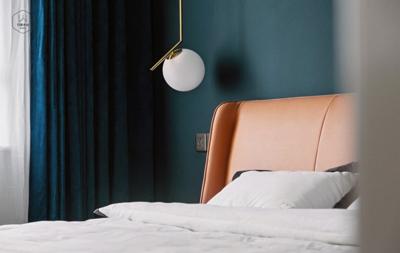 深蓝色背景墙配合金色壁灯让卧室气质瞬间提升,橘色点缀驱走沉闷,让卧室空间灵动活跃。