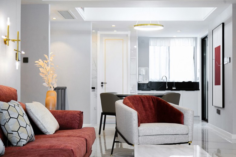 砖红色L型布艺沙发为空间注入活力,利落的金属线条和流畅的空间动线也实现屋主想要的简约质感。
