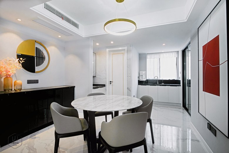 客餐厅一体,让空间在视觉上更为通透,圆桌不仅有着圆满的寓意,还能节约空间,餐厅不会显得拥挤。
