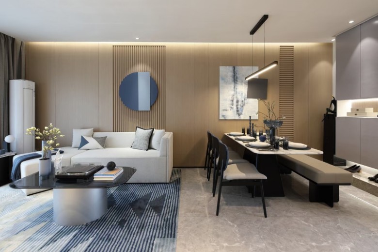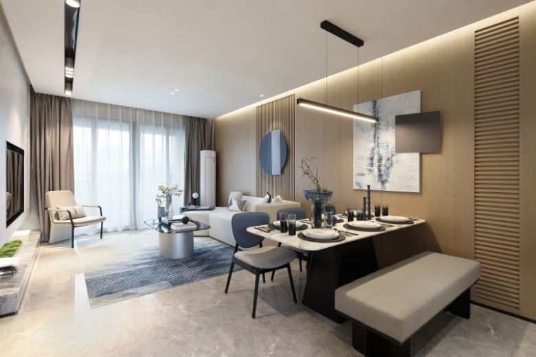 现代雅致风,客餐厅木饰面墙面爱了,空间配色大气!