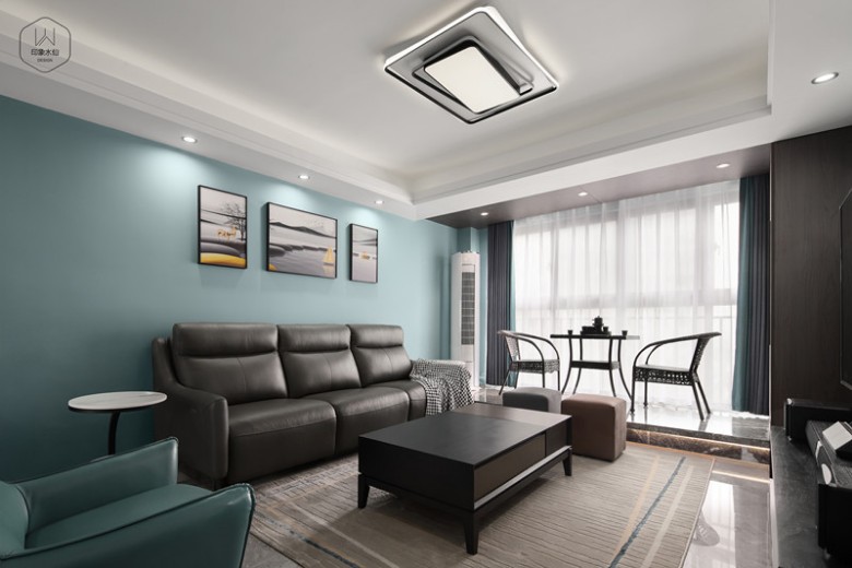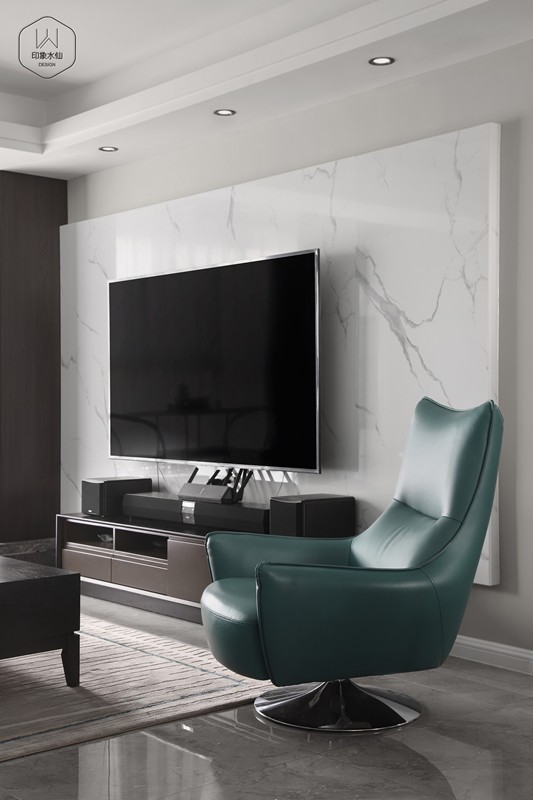 客厅与阳台打通,宽敞透亮,蓝色的沙发背景,阳光洒进来的那一刻,皮质家具的光泽感带起空间的节奏感;浅灰色电视背景做了凸出的爵士白大理石的铺设,鲜明的线条、材质肌理,共同演绎刚而不冷、张而不显的质感魅力。