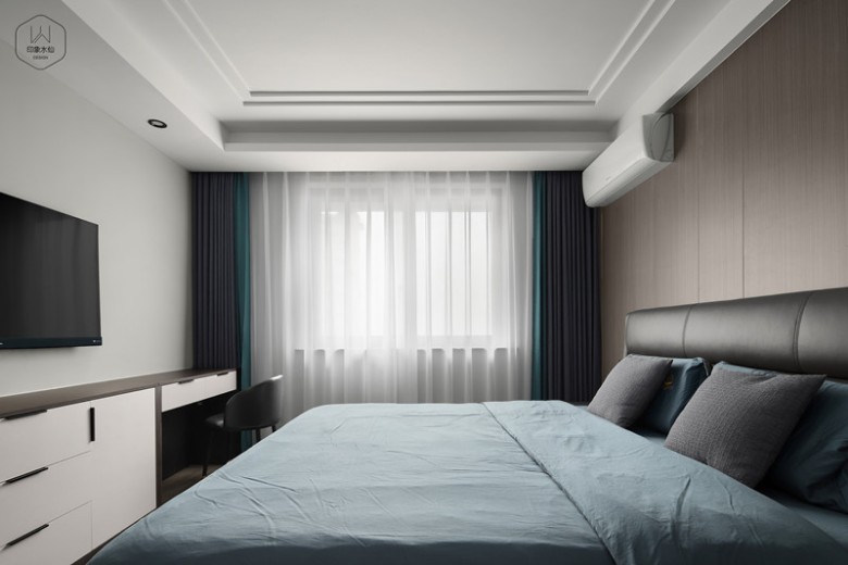 主卧床头背景以温暖木质包裹墙面,阳光洒下,灯光照射,厚实温暖的氛围悠悠然;每一处设计都彰显着居住者优雅的生活状态与情调,踏足于此,因工作而疲惫的身心,回归平静。
