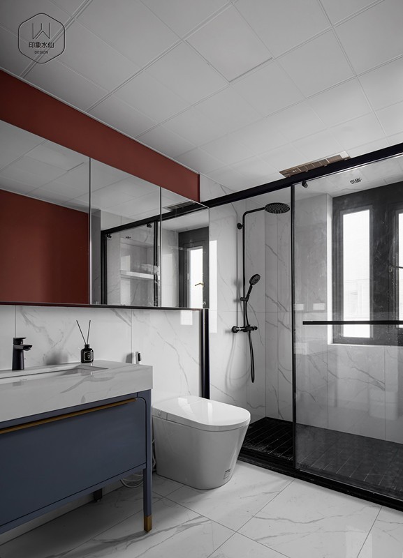 内卫空间大面积黑白灰,融入复古的砖红色,让空间变得精致有情调,业主非常满意最后的落地效果,整个空间的刻意也让生活充满质感。