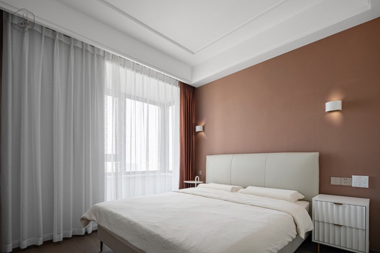 款款步入卧室,私密的空间里,素雅的色彩轻声诉说睡梦里的故事。两侧艺术壁灯让墙壁焕发意趣,使得主卧空间一番整体而统一的秩序美感。