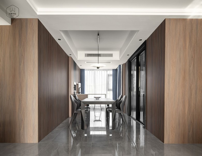设计师根据业主需求,水吧台及家电的嵌入式设计兼具美观与实用性。充分利用空间,打造收纳区,造型简单纯碎,以利落的线条与块面来打造内敛的高级感。