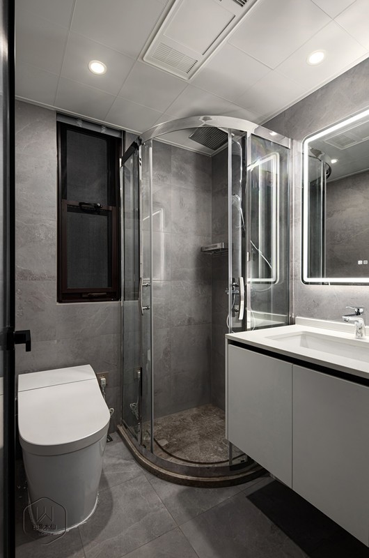移步卫浴空间,大面积灰色石材铺贴营造出内敛的高级质感。空间雅奢兼备,纯净且充满自然灵动。
