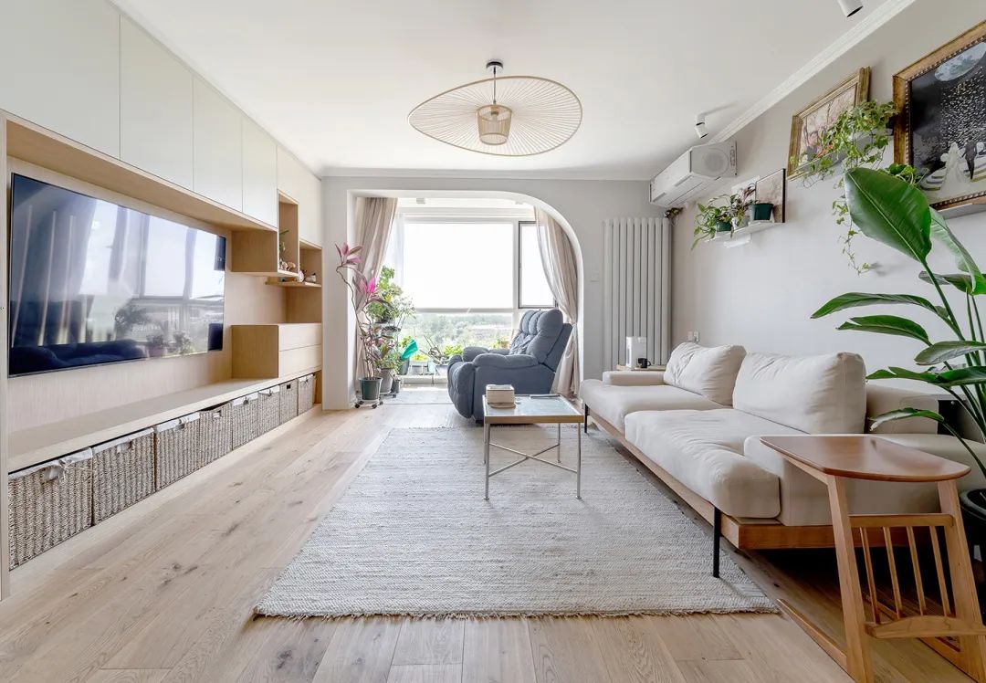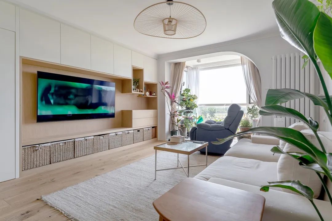 客厅设计了整面电视柜,方便客厅的收纳同时,也利于电视的嵌入,既保证了美观性也有功能性。最下面的编织筐,也呼应了客厅的整体氛围。