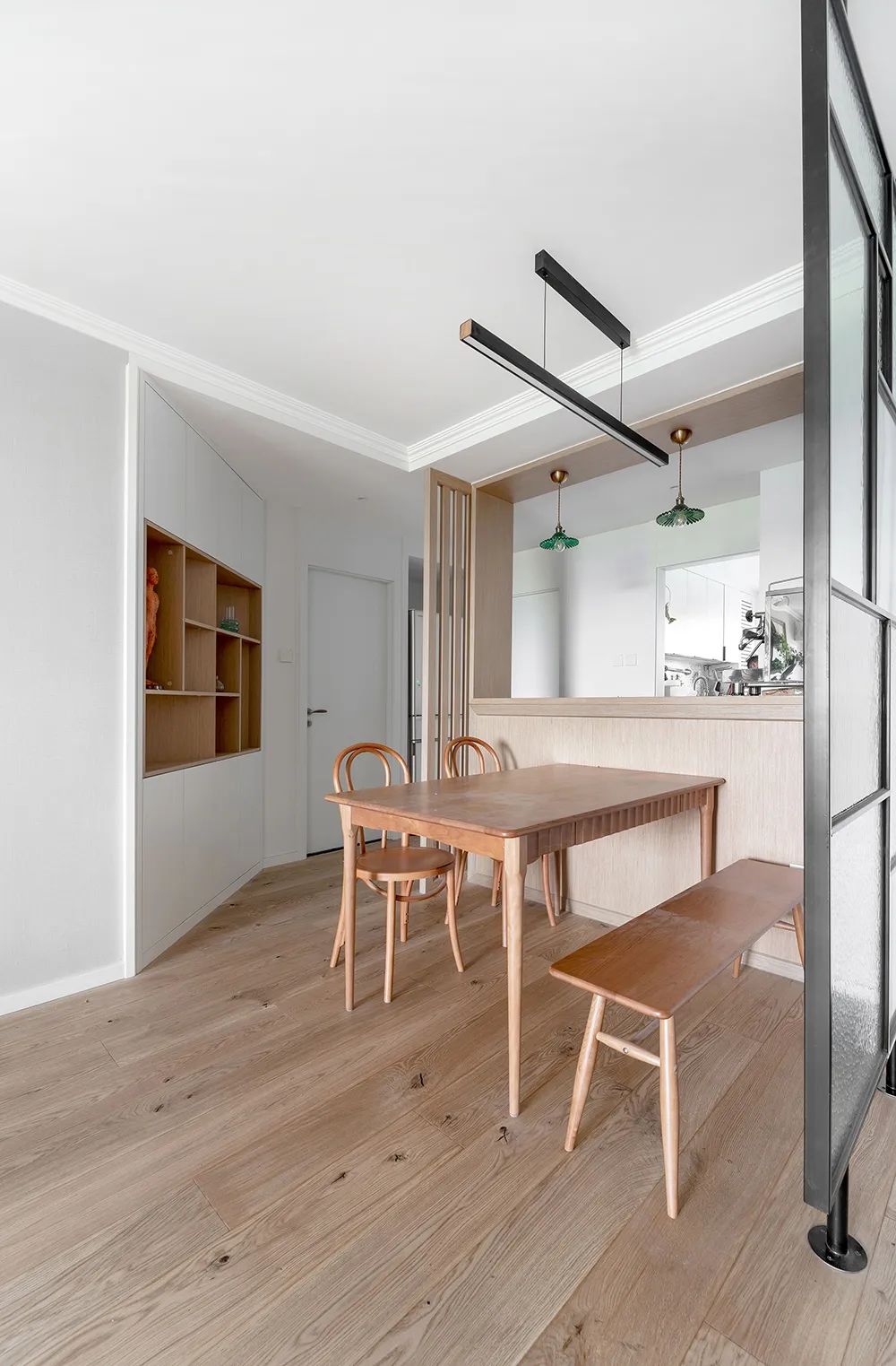 入户屏风有效的提升了餐厅的私密性,同时打开后的厨房,也和餐厅紧密的联系在一起了。