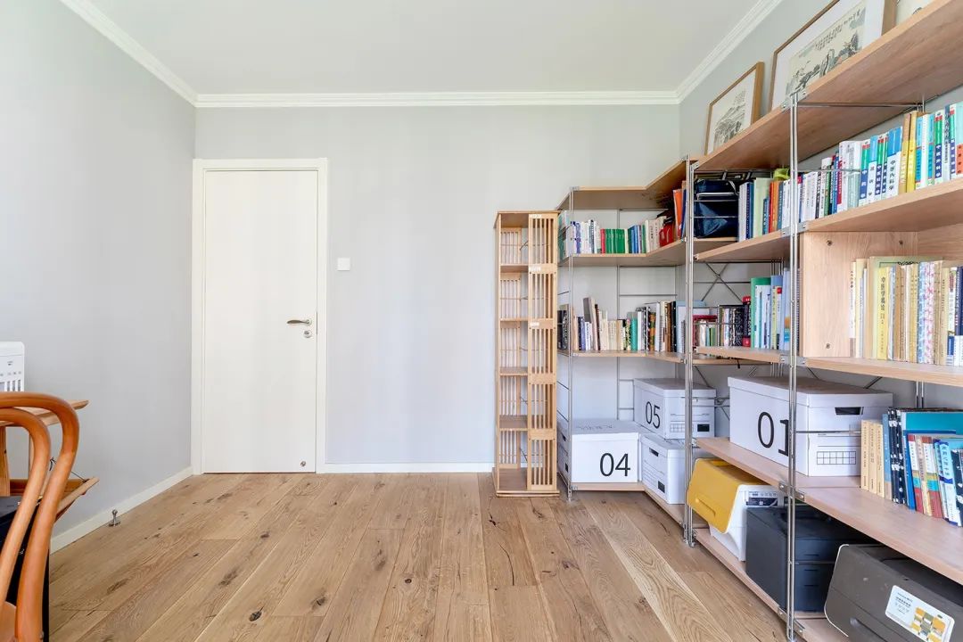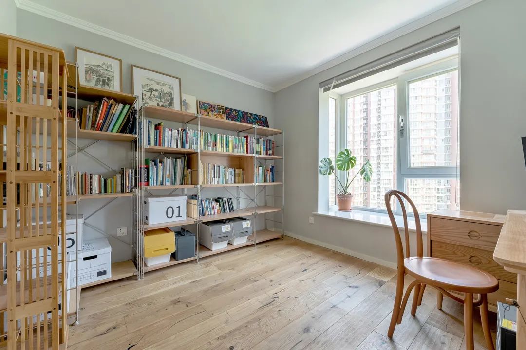 没有完全固定式的书柜,主要是方便以后有孩子,能灵活变换成儿童房。只需要换家具就可以,不会破环任何基础设施。
