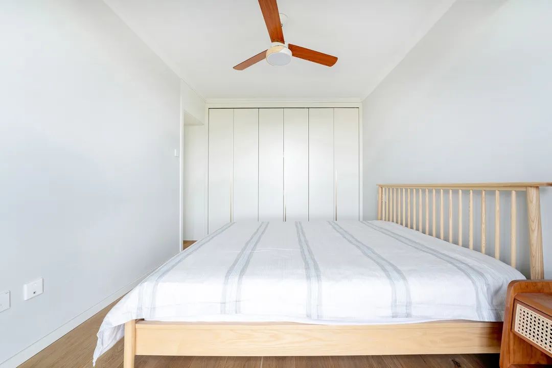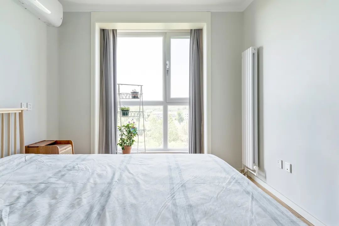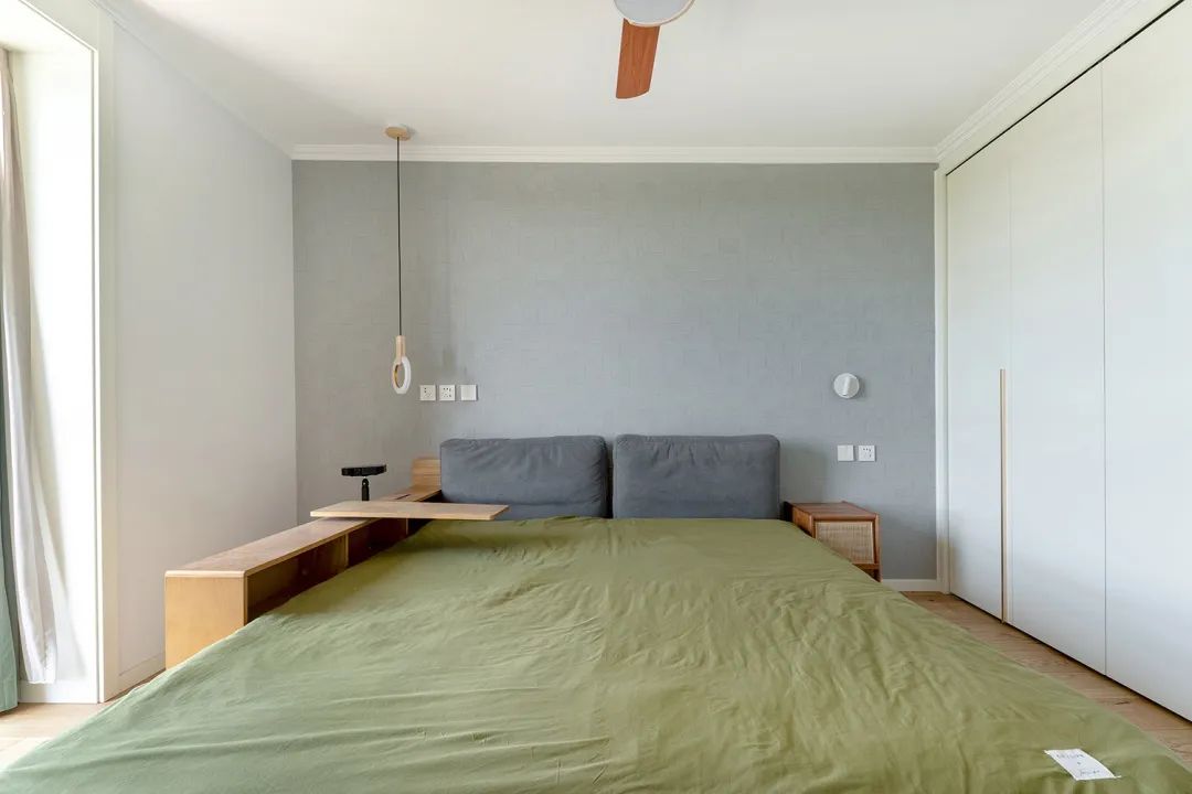 主卧的床头背景贴了壁纸,相对于色漆的区别,就是它本身自带的纹理变化。这样近距离看,视觉上还是有所不同,再加上觊觎已久的双人床,一个既淡雅又舒适的空间就有了。