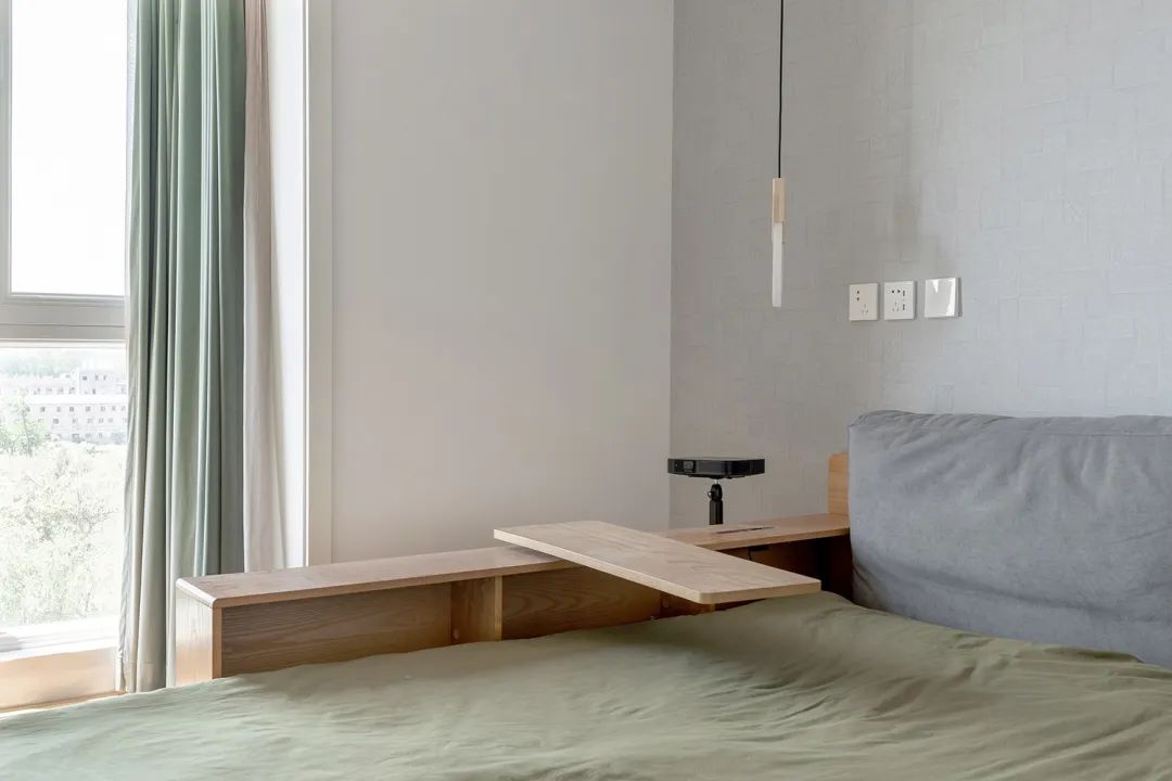 床右侧的有一个竖向的床头柜,上面的台面也可以来回旋转,平时在床上看书的时候,也方便放置一些随手物品。