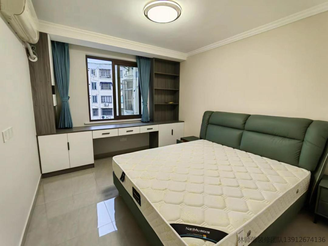 主卧的空间比较大,除了衣柜外,靠窗还设计了一个书桌,平时可以在这里办公,非常方便。蓝绿色的软包床和蓝色窗帘相互呼应,清新自然。