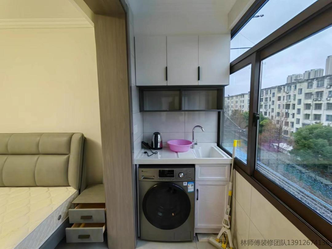 阳台是次卧的延伸,中间没有做移门隔断,采光好,空气流通性好。阳台做了洗衣池还有吊柜,能满足日常洗晒需求。