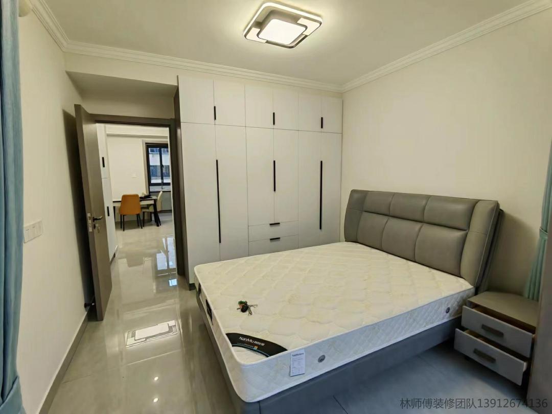 次卧是灰色的床+白色的衣柜,也是非常简约舒适的设计。
