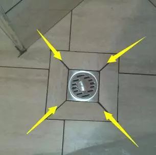 在4块瓷砖的交汇处,以地漏为中心,地漏的4个角对准瓷砖的边,这种只适合方形的地漏,美观大方,设计坡度也比较自然。