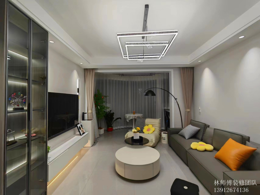 客厅朝南,采光充足,电视墙和沙发墙都没有做任何设计,大面积留白让空间显得更加干净清爽。电视柜设计的吊柜,底下有藏光,方便清扫也更美观。电视机边的黑色橱柜,尽显高级感。双层细框吊灯,精致且个性。与错层设计的茶几相互辉映。