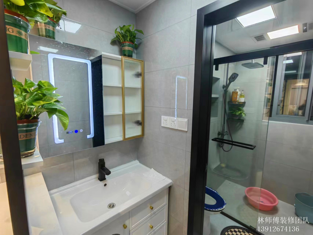 洗手间干湿分离,洗手池搬到外面,使用起来更方便。镜面柜收纳能力高。淋浴间玻璃移门,洗澡水不会外溅,方便打扫。壁龛设计,更好用。
