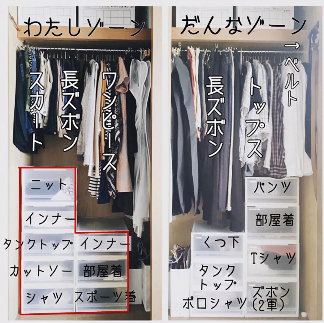 在衣柜中留出弹性空间,利用塑料透明的收纳箱或收纳框进行收纳都不错,比如下面这样,空间利用更充分,而且也比较灵活,也是可随需求变化的。