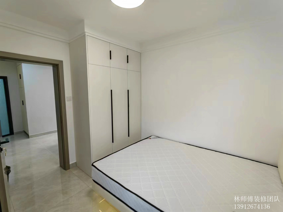 主卧舒适宽敞,雾蓝色的背景墙,静谧优雅,营造出舒适的睡眠环境。整墙的到顶衣柜,能满足日常生活需求。