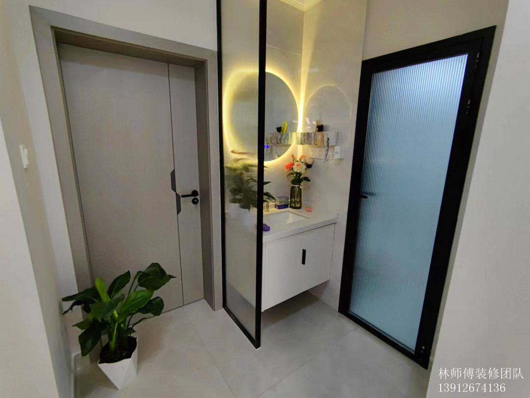 家里只有一个洗手间,但是生活的人员比较多,所以洗手间实行了三分离。将洗手池外移,使用起来更加方便。圆镜+氛围灯,超有气氛!