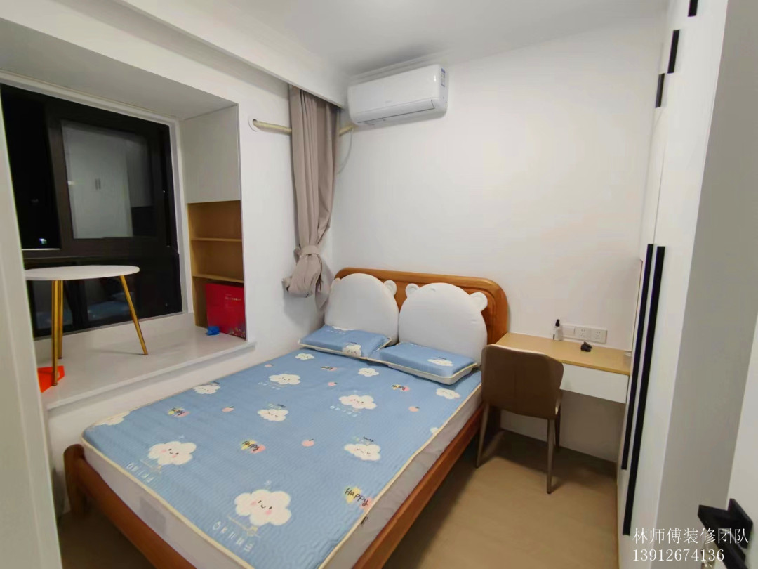 这个是儿子房,蓝色的小床,也是充满童趣。飘窗上设计了柜子,可以当做书架,床边,衣柜延伸出来的书桌,用来写作业。每一处空间的利用都非常完美。