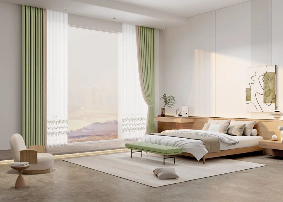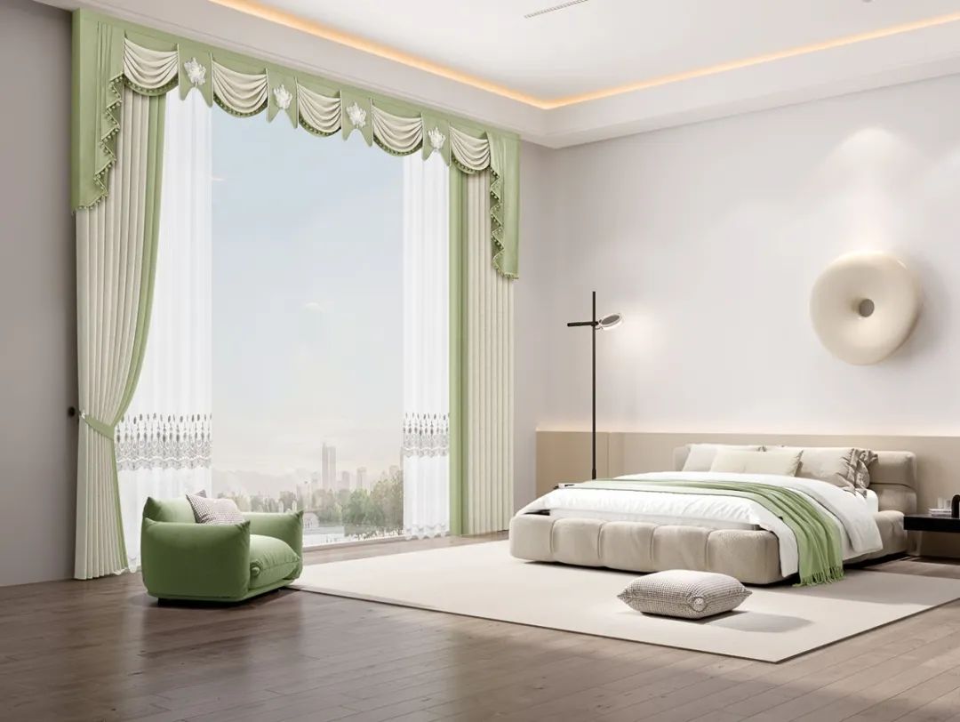 相比抹茶绿而言更淡更温柔,给人一种清冷又仙气的感觉,适合搭配米色系、灰色系的墙面与家居,用于客厅、卧室、书房。