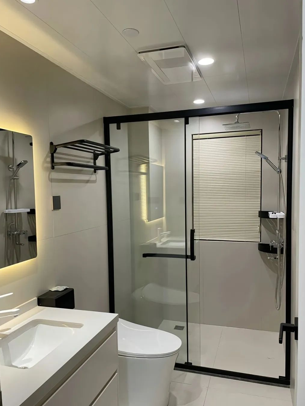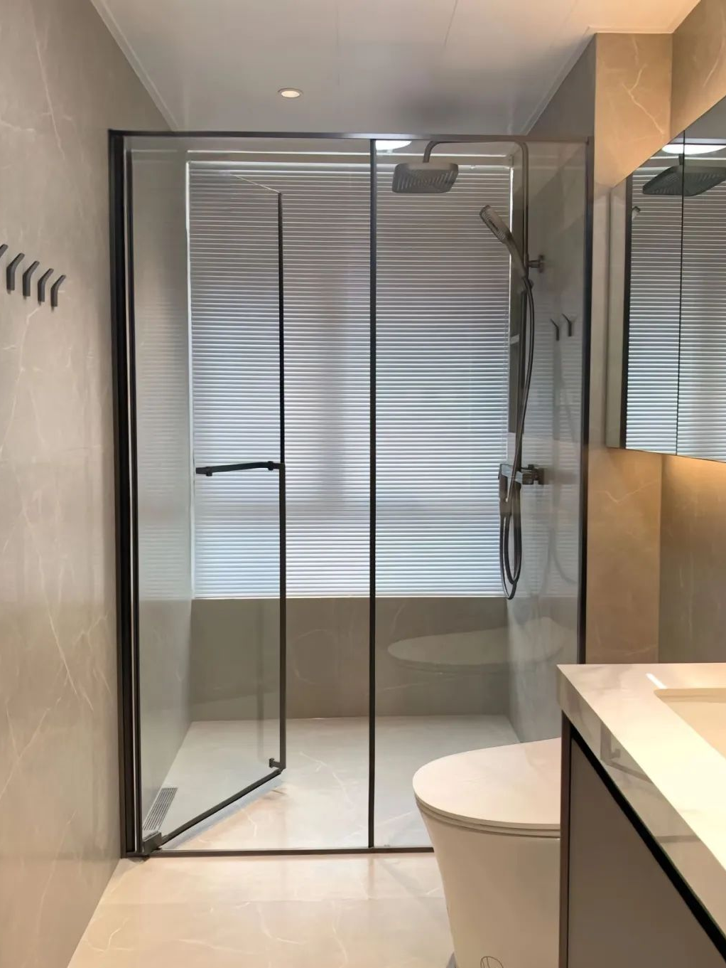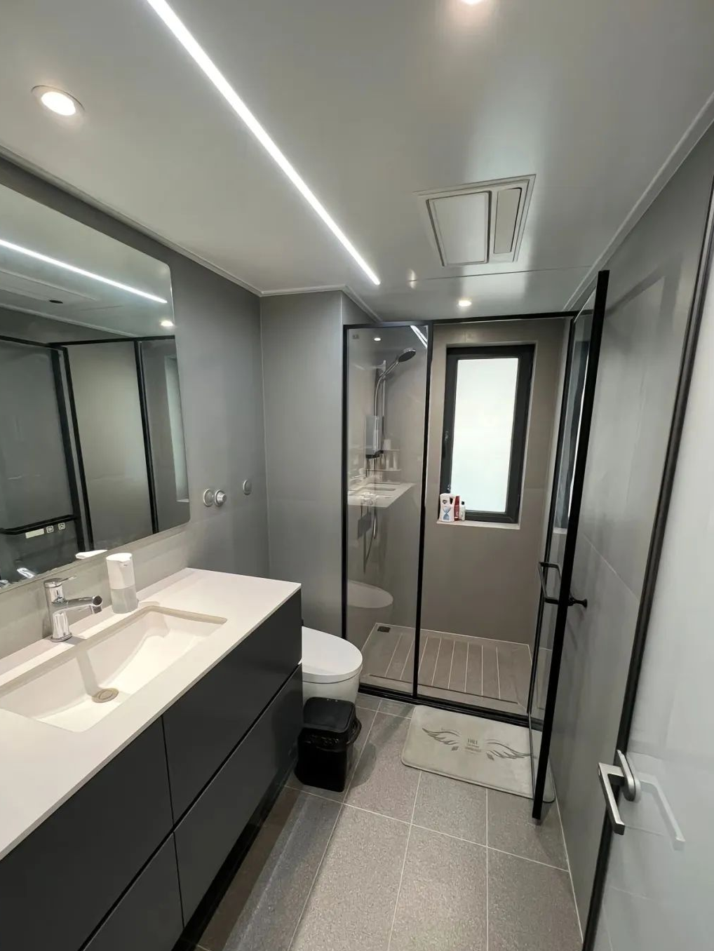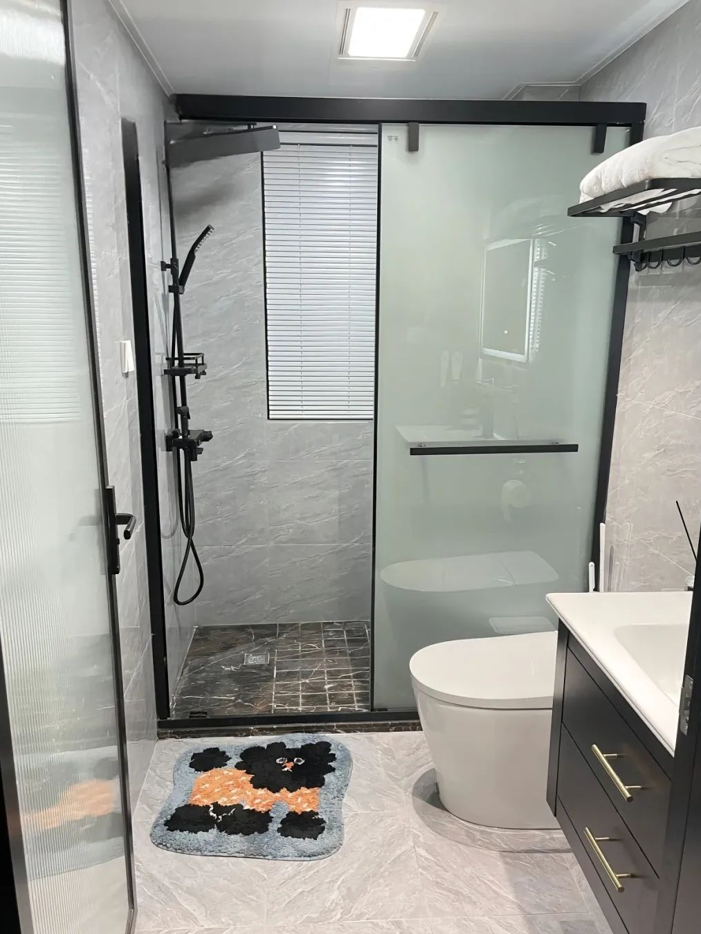 卫生间墙面直接用 600mmx1200mm 的砖上墙,大气且舒适。采光好的可以用深色大花纹,采光一般的可以用浅色小花纹。