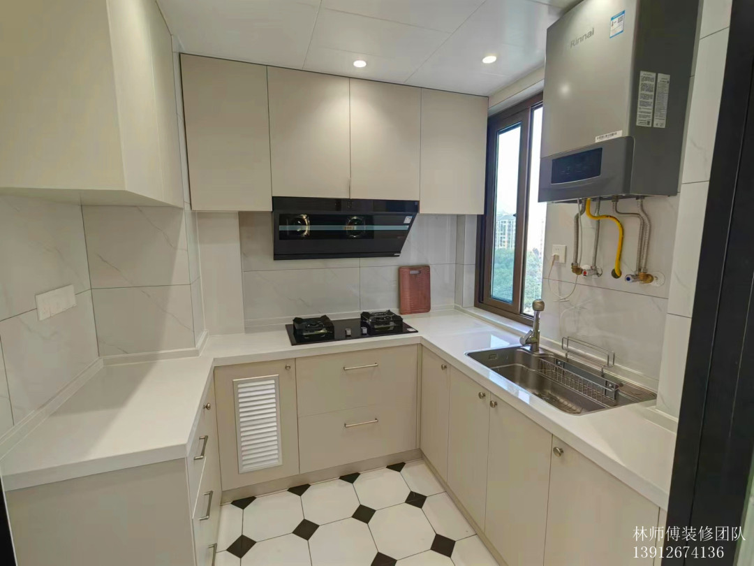 米白色厨房干净整洁。u型设计,增加储物空间。大单槽使用起来也是非常方便的哦。